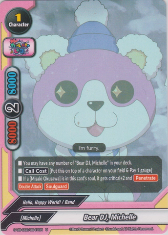 - All 《Hello, Happy World!》 character on your field get power+5000, and their soul cannot be dropped by your opponent's card effects.