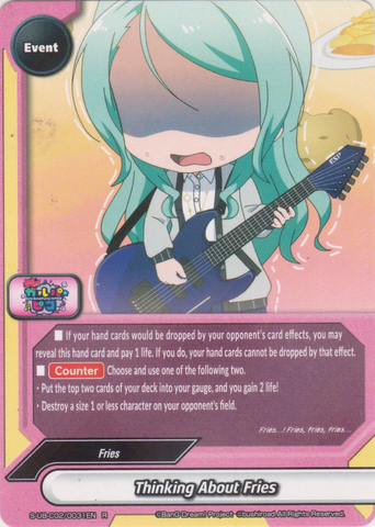 - If a 《Band》 character on your field would leave the field, you may put this card from your drop zone on the bottom of your deck, and pay 1 life. If you do, that card remains on the field.