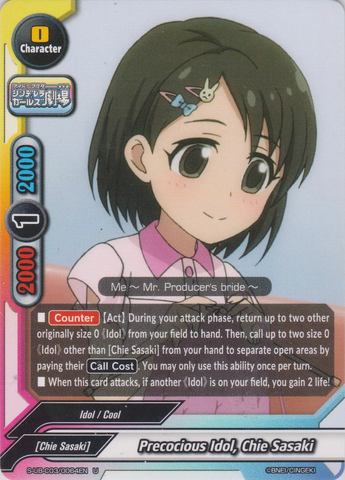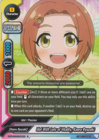 - [Counter] 【Act】If there are three different size 0 《Idol》 on your field, [Stand] all characters on your field. This ability can only be activated once per turn.