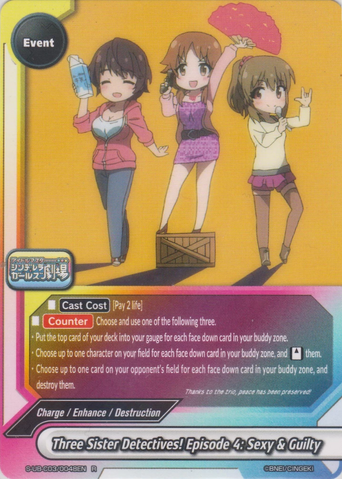 - [Counter] [Rest] a card on your opponent's field. Then, if a face down card is on your buddy zone, [Rest] a card on your opponent's field.