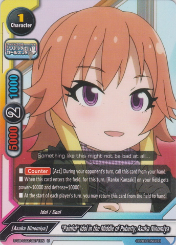 - "Drown in the Darkness" When another 《Idol》 character enters your field, draw two cards. "Drown in the Darkness" only activates once per turn. When this card attacks, if <Asuka Ninomiya> is on your field, for this turn, <Asuka Ninomiya> on your field and this card get [Double Attack] and [Soulguard].