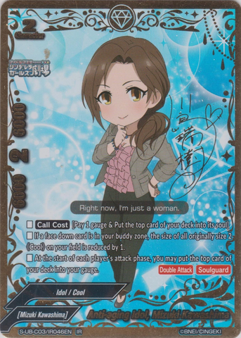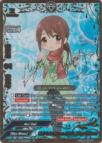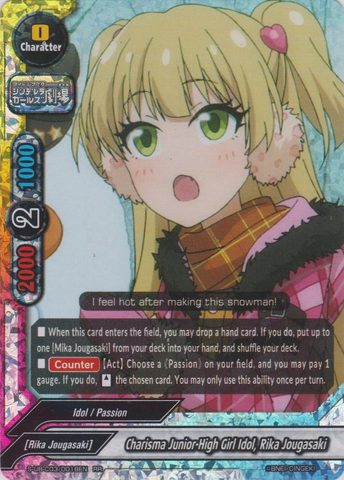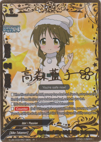 - [Counter] 【Act】 During an attack on your opponent's turn, you may return this card from the field to hand. If you do, nullify the attack, and if <Rika Jougasaki> is on your field, deal 2 damage to your opponent!