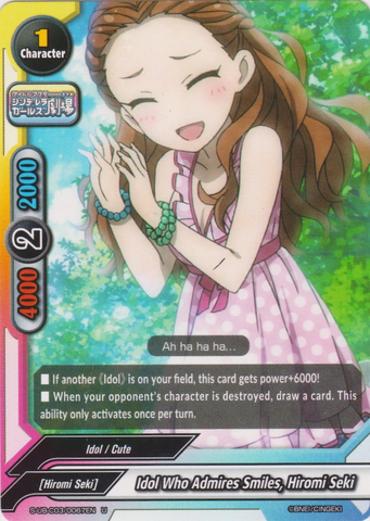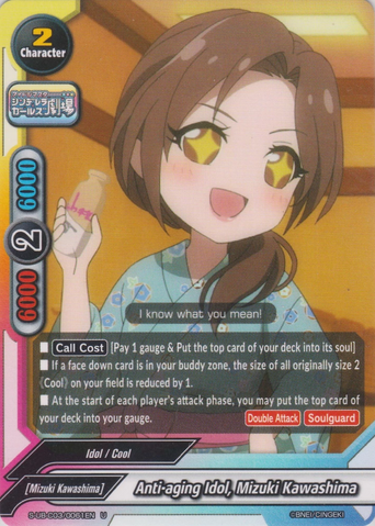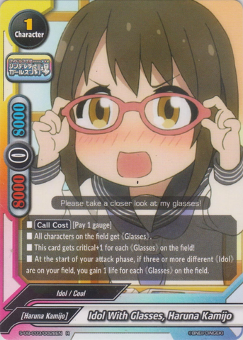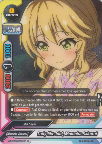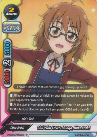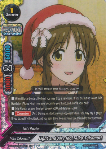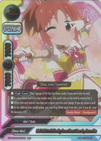 - When this card attacks, put the top card of your deck into your gauge, and you gain 1 life! Then, if three or more different 《Idol》 is on your field, draw a card.
