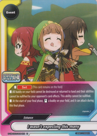 - All buddies on your field cannot be destroyed, or returned to hand, and their abilities cannot be nullified, by your opponent's card effects. This ability cannot be nullified.