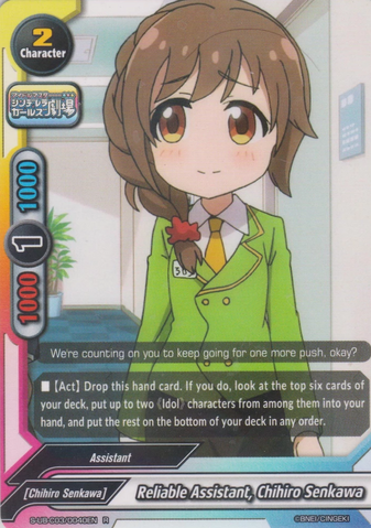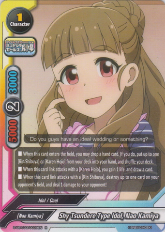 - [Counter] 【Act】If <Karen Hojo> and <Nao Kamiya> is on your field, [Stand] all 《Idol》 on your field. You may only use this ability once per turn.