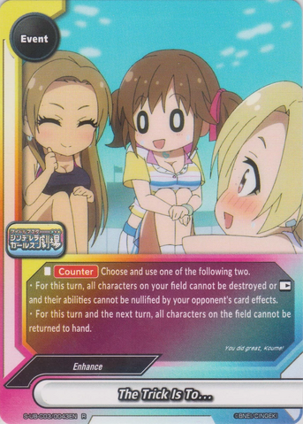 - [Counter] Choose an 《Idol》 on your field. For this turn, the next time that card would be destroyed, nullify its destruction, and for this turn, give it [Counterattack].