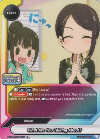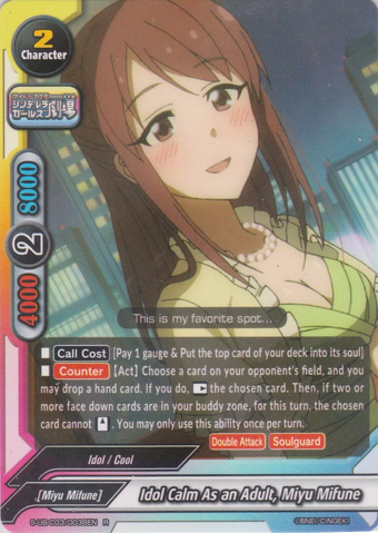 - [Counter] Nullify the attack. Then, if three or more different 《Idol》 are on your field, put the top card of your deck into your gauge, you gain 1 life, and draw a card.