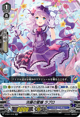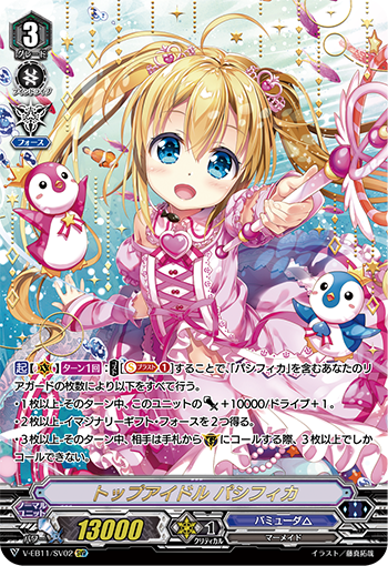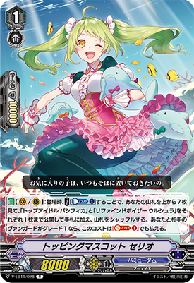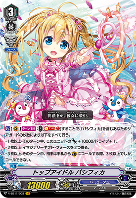 AUTO [R]: At the end of the battle it boosted a rear-guard, COST[C-Blast (1) & return this unit to your hand], look at seven cards from the top of your deck, reveal up to one "Top Idol, Pacifica" from among them and put it into your hand, and shuffle your deck