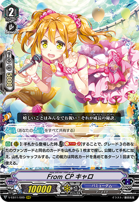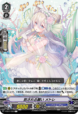 [♪Melody] - CONT [V/R]: During the battle it attacked a vanguard, this unit gets [Power]+5000. This is shared by all of your units with [♪Melody].