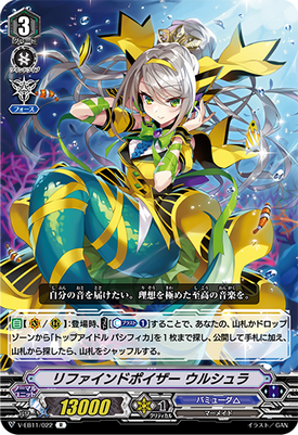 AUTO [V/R]: When placed, COST[C-Blast (1)], look at seven cards from the top of your deck, reveal up to one "Top Idol, Pacifica" and a "Refined Poiser, Urszula" each from among them and put them into your hand, and shuffle your deck. If your and your opponent's vanguard are grade 1, you may pay "[S-Blast (1)]" for this cost.