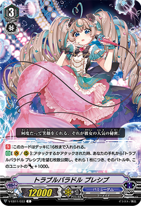 AUTO [V/R]: When it attacks or is attacked, reveal any number of "Trouble Ballad, Precibe" from your hand, and this unit gets [Power] +1000 until end of that battle for each of those cards.
