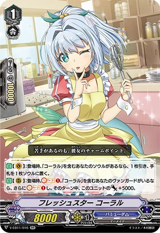 AUTO [R]: When placed, [S-Charge (1)]. If you have a vanguard with "Coral" in its card name, [S-Charge (1)], and this unit gets [Power] +5000 until end of turn.
