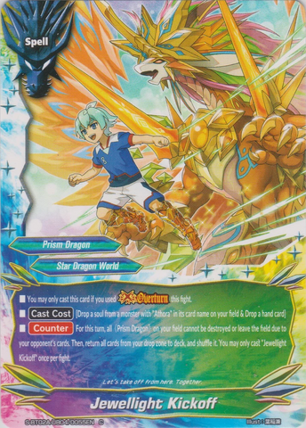 - [Counter] For this turn, all 《Prism Dragon》 on your field cannot be destroyed or leave the field due to your opponent's cards. Then, put all cards from your drop zone into your deck, and shuffle it. You may only cast "Jewellight Kickoff" once per fight.