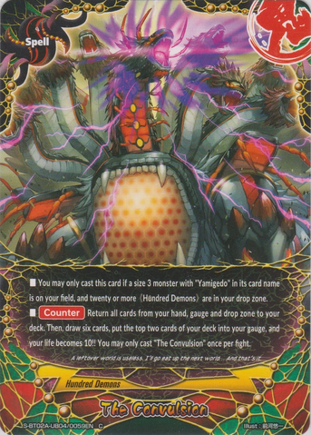 - [Counter] Return all cards from your hand, drop zone, and gauge into your deck, and shuffle your deck. Then, draw 6 cards, put the top two cards of your deck into your gauge, and your life becomes 10. You may only cast "The Convulsion" once per fight.