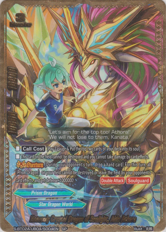 - You may only cast this card during your opponent's final phase, if you did not take damage during your opponent's turn, you have a 《Prism Dragon》 with "Athora" in its card name on your center, and your opponent's life is 5 or less.