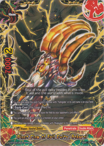 - When this card enters the field, you may drop a hand card. If you do, put the top card of your deck into your gauge, put up to one 《Hundred Demons》 item from your deck into your hand, and shuffle your deck.