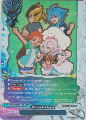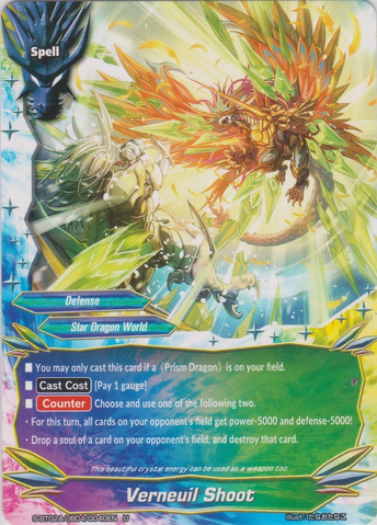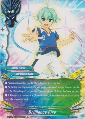- Put the top card of your deck into your gauge, draw a card, and put this card into the soul of a 《Prism Dragon》on your field. You may only cast "Brilliancy Fire" once per turn.