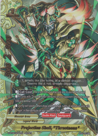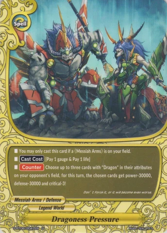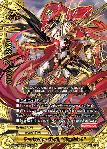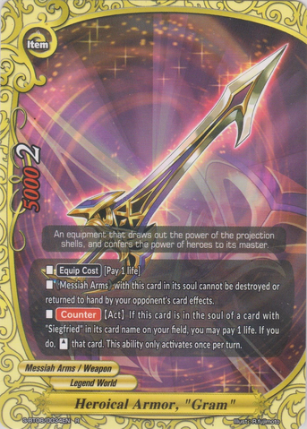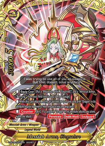 - [Counter] 【Act】 During a battle where you are being attacked, if this card is in soul of a《Messiah Arms》 on your field, you may pay 1 gauge. If you do, nullify that attack. You may only use this ability once per turn.Secret