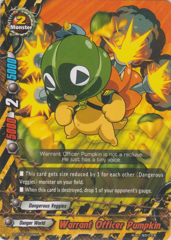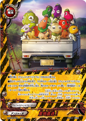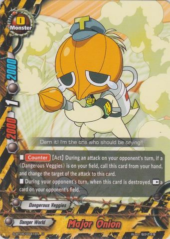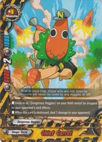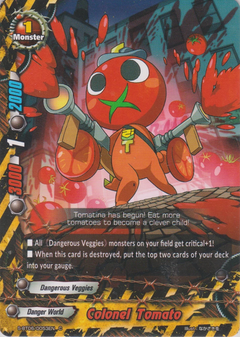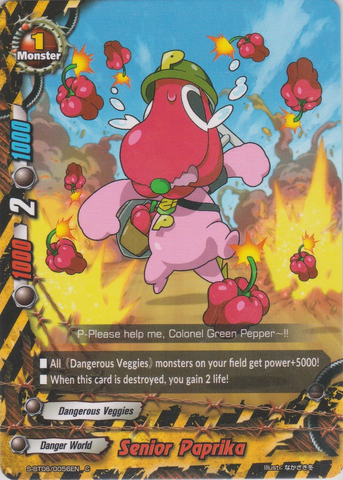 - [Counter] 【Act】 Call up to one 《Dangerous Veggies》 other than "Colonel Green Pepper" from your drop zone by paying its [Call Cost]. You may only use this ability once per turn. When this card attacks and destroy your opponent's monster, [Stand] this card.