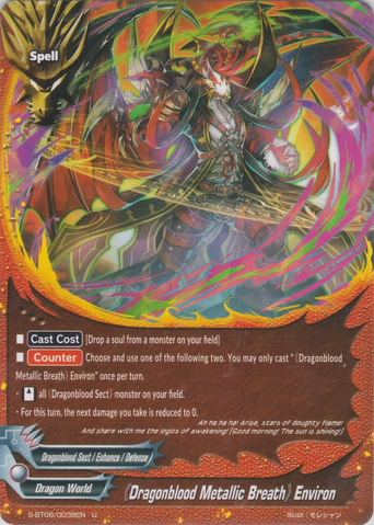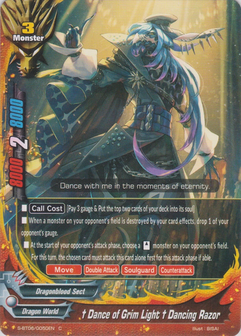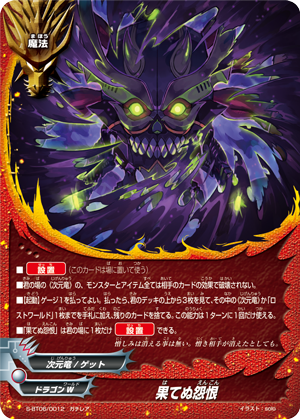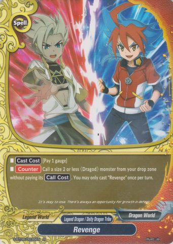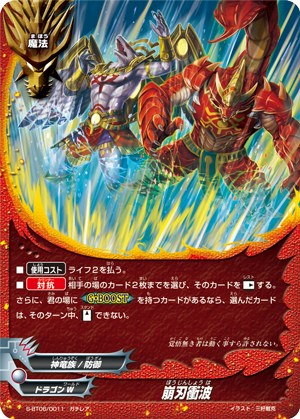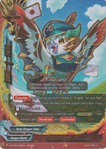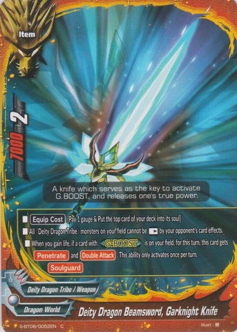 - [Counter] 【Act】 During your turn, choose one 《Dragod》 on your field, and you may put this card from the field into the chosen card's soul. If you do, [Stand] the chosen card. If this card is in the soul of a monster with <G•BOOST>, that monster gets [Penetrate] and [Counterattack].
