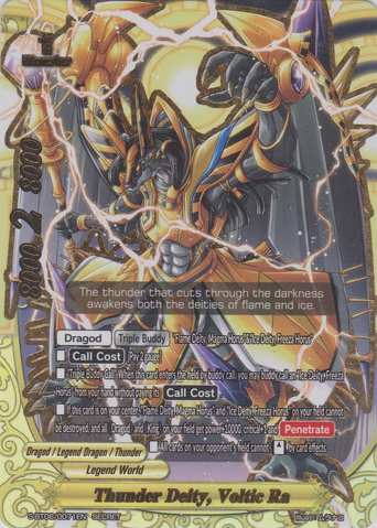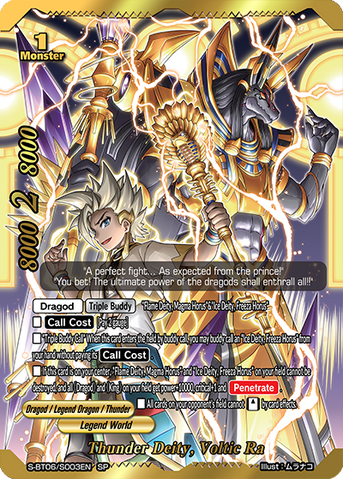 - If this card is on your center, all "Flame Deity, Magma Horus" and "Ice Deity, Freeza Horus" on your field cannot be destroyed, and all 《Dragod》 and 《King》 on your field get power+10000, critical+1 and [Penetrate].