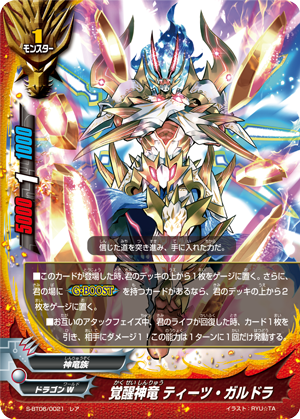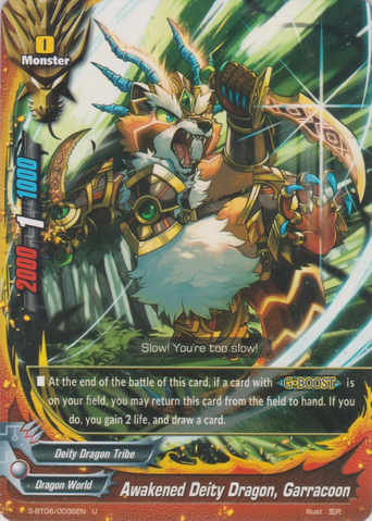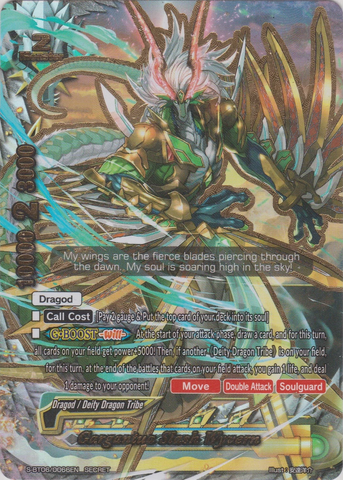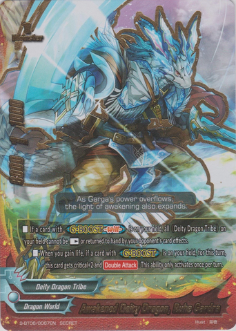 - <G•BOOST-Heart-> At the start of your attack phase, draw a card and, for this turn, all cards on your field get power+5000. Then, if another 《Deity Dragon Tribe》 is on your field, for this turn, at the end of the battle that a card on your field attacked, you gain 1 life, and deal 1 damage to your opponent!
