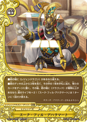 - Look at 3 cards from the top of your deck, put one from among them into your hand, put the rest into your gauge. Then, if 2 or more different 《Dragod》 are on your field, you gain 2 life! You may only cast "Sku Fil Ahramat" once per turn.