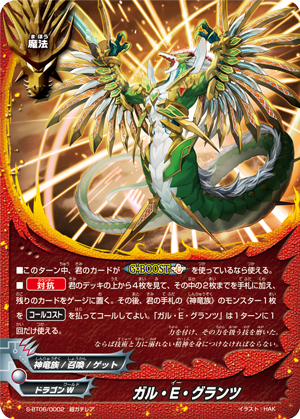 - [Counter] Look at four cards from the top of your deck, put two from among them into your hand, and put the rest into your gauge. Then, you may call a 《Deity Dragon Tribe》 monster from your hand by paying its [Cast Cost]. You may only cast "Gar-E-Granz" once per turn.