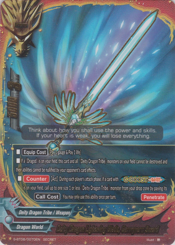 - [Counter] 【Act】 During each player’s attack phase, if a card with <G•BOOST-Heart-> is on your field, call up to one size 1 or less 《Deity Dragon Tribe》 monster from your drop zone by paying its [Call Cost]. This ability only activates once per turn.