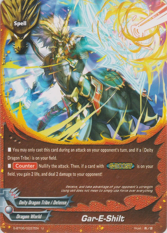- [Counter] Nullify the attack, and if there are two or more different 《Dragod》 on your field, put up to one spell with "Shield" in its card name from your drop zone into your hand.