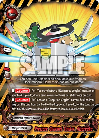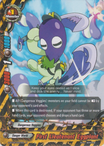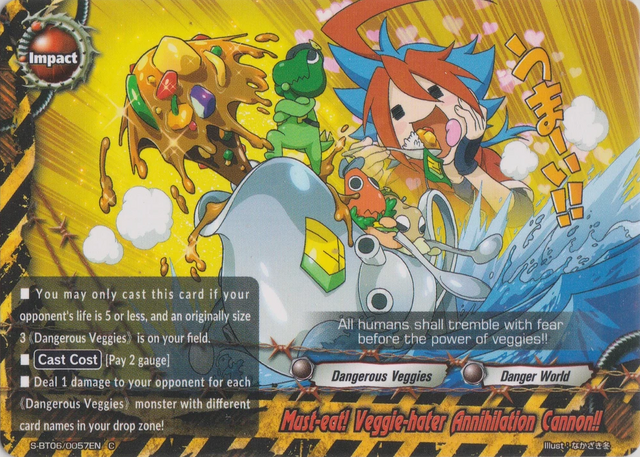 - [Counter] 【Act】 Choose a 《Dangerous Veggies》 on your field, and you may put this card from the field in to the drop zone. If you do, the next time the chosen card.