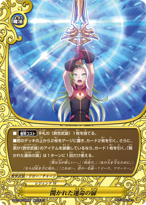 - Put the top two cards of your deck into your gauge, and draw two cards. Then, if you are equipped with a 《Messiah Arms》 item, draw a card. You may only cast "The Open Door of Fate" once per turn.