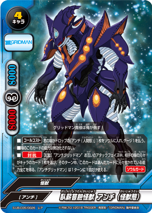 - [Counter] 【Act】 During each player's attack phase, you may put this card from your field into the drop zone. If you do, call a "Trials and Tribulations Kaiju, Anti (Kaiju Form)" or "Gridknight" from your hand or deck by paying its [Call Cost]. If you searched your deck, shuffle it.