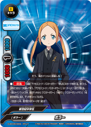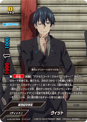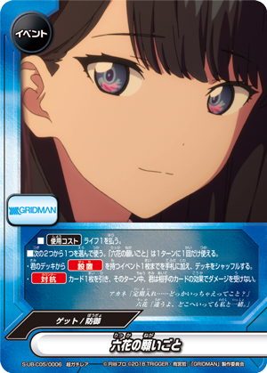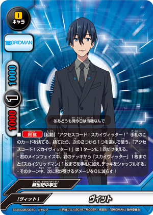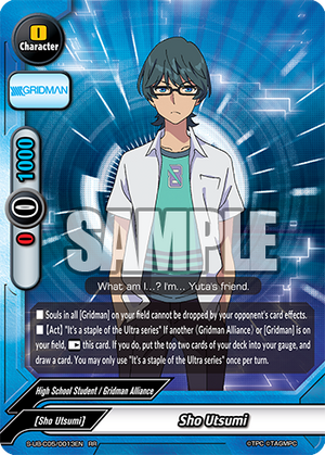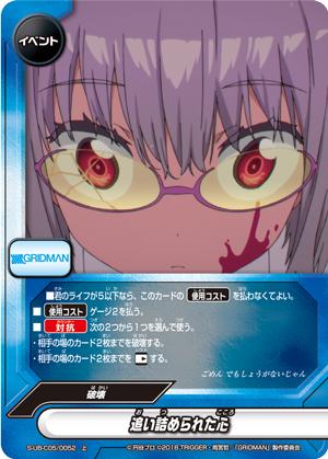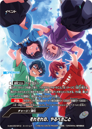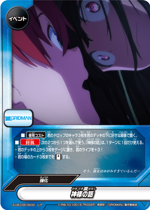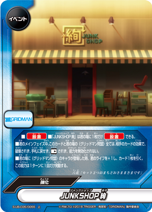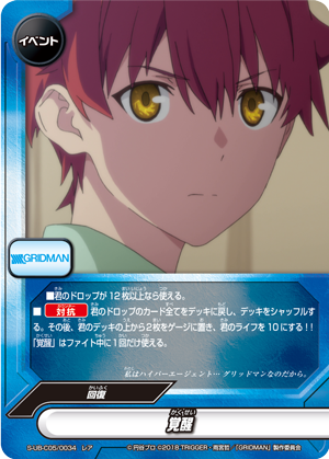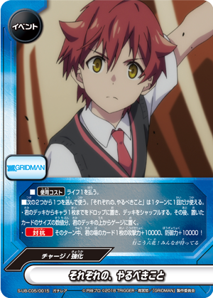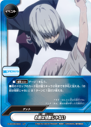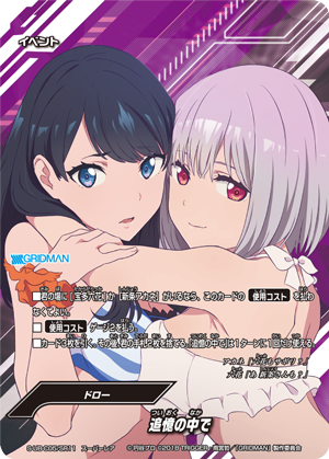- [Counter]【Act】Choose a card on your field, and you may drop this hand card and pay 1 gauge. If you do, [Stand] that card, and if that card is <Gridman>, draw a card.