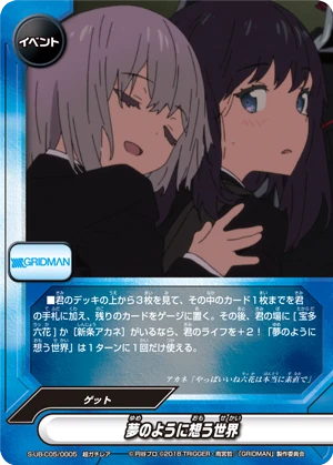 - Look at the top three cards of your deck, put up to one card from among them into your hand, and put the rest into your gauge. Then, if <Rikka Takarada> or <Akane Shinjo> is on your field, you gain 2 life! You may only cast "Dream-like World" once per turn.