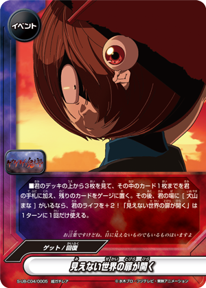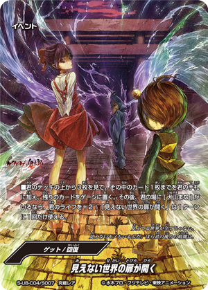 - Look at the top three cards of your deck, put up to one card from among them into your hand, and put the rest into your gauge. Then, if you have <Inuyama Mana> on your field, you gain 2 life! You may only cast "Door to the Unseen World Opens" once per turn.