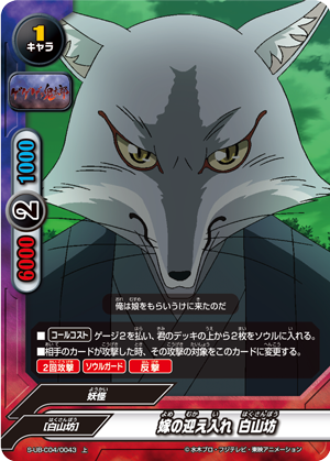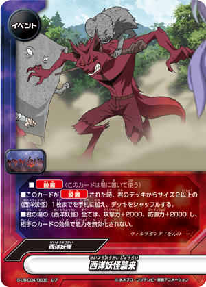 - [Counter] 【Act】 Destroy a character on your opponent's field. If you do, put up to one card from the top of your deck face down on the field as a "《Western Youkai》/size 0/6000 power/2000 defense/2 critical" character, and you gain 2 life! You may only use this ability once per turn.