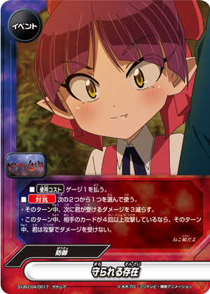 - When your hand cards would be dropped by your opponent's card effects, you may reveal this hand card and pay 1 life. If you do, your hand cards cannot be dropped by that effect.