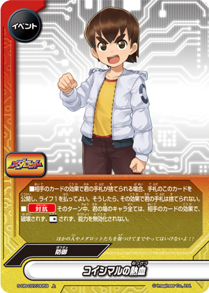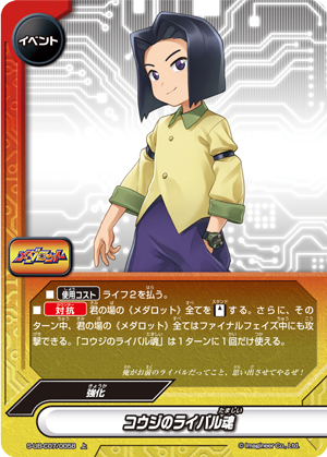 - [Counter] [Stand] all 《Medabot》 on your field. Then, for this turn, all 《Medabot》 on your field can attack during the final phase. You may only cast "Koji's Rival Spirit" once per turn.