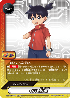 - [Counter] Put the top two cards of your deck into your gauge. Then, if two or more 《Medabot》 are on your field, draw two cards. You may only cast "Ikki's Burning Soul" once per turn.
