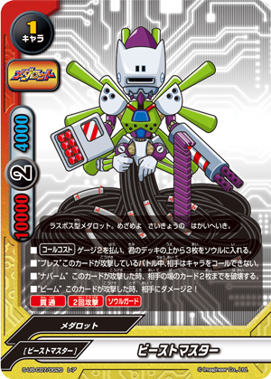 - [Counter]【Act】"Beam" During your turn, drop all souls from a character on your opponent's field, and destroy that card. You may only use this ability once per turn.