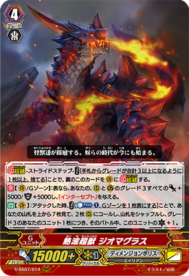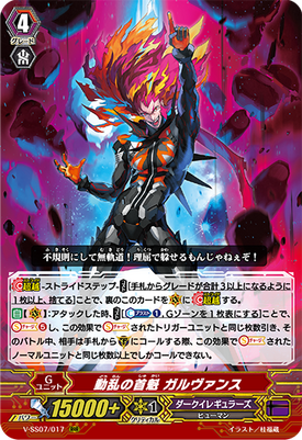 ACT [G zone]: If you have five or more units with the same card name each, and your vanguard is grade 3, COST[S-Blast (1)], [Stride] this card on your [V] from face down, and during the battle this unit attacked this turn, your opponent can only call cards from hand to [G], and must call five or more cards at the same time.