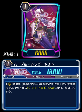 [R]: When placed, [Put another rear-guard into your soul] to call a card other than Purple Trapezist from your soul.