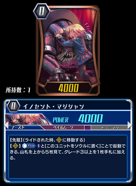 [R]: [C-Blast (1)] & [Put this unit into your soul] to activate. Look at five cards from the top of your deck, and put one grade 3 or greater into your hand.