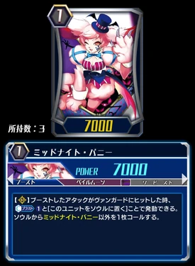 [R]: When the attack it boosted hits a vanguard, [C-Blast (1)] & [Put this unit into your soul] to activate. Call a card other than Midnight Bunny from your soul.
