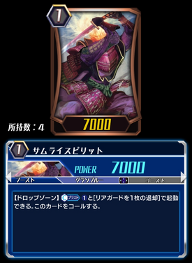 [Drop Zone]: If your vanguard is grade 2 or greater, [put one Samurai Spirit and Knight Spirit into your soul] to ride this card. If you rode on a grade 2, draw a card.