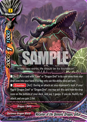 - [Counter]【Act】If your flag is "Dragon Zwei" or "Dragon Drei", you may drop this hand card. If you do, for this turn, all cards with "Dragon" in their attributes on your field cannot be destroyed or returned to hand and their abilities cannot be nu