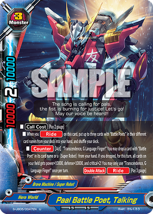 - [Counter]【Act】"Transcendence, G Language Finger!" You may drop a card with "Battle Poet" in its card name or a 《Super Robot》 from your hand. If you do, for this turn, all cards on your field get power+10000, defense+10000 and critical+2! You may only use "Transcendence, G Language Finger!" once per turn.