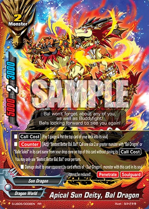 - [Counter]【Act】"Bestest Better Bal, Bal!" Call one size 2 or greater monster with "Bal Dragon" or "Balle Soleil" in its card name from your drop zone on top of this card without paying its [Call Cost]. You may only use "Bestest Better Bal, Bal!" once per turn.