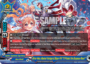 - When this card is dropped from your hand, if you are [Transform] into a card with "Masked Vantage" in its card name or a 《Super Warrior》, put the top card of your deck into your gauge, and draw a card.